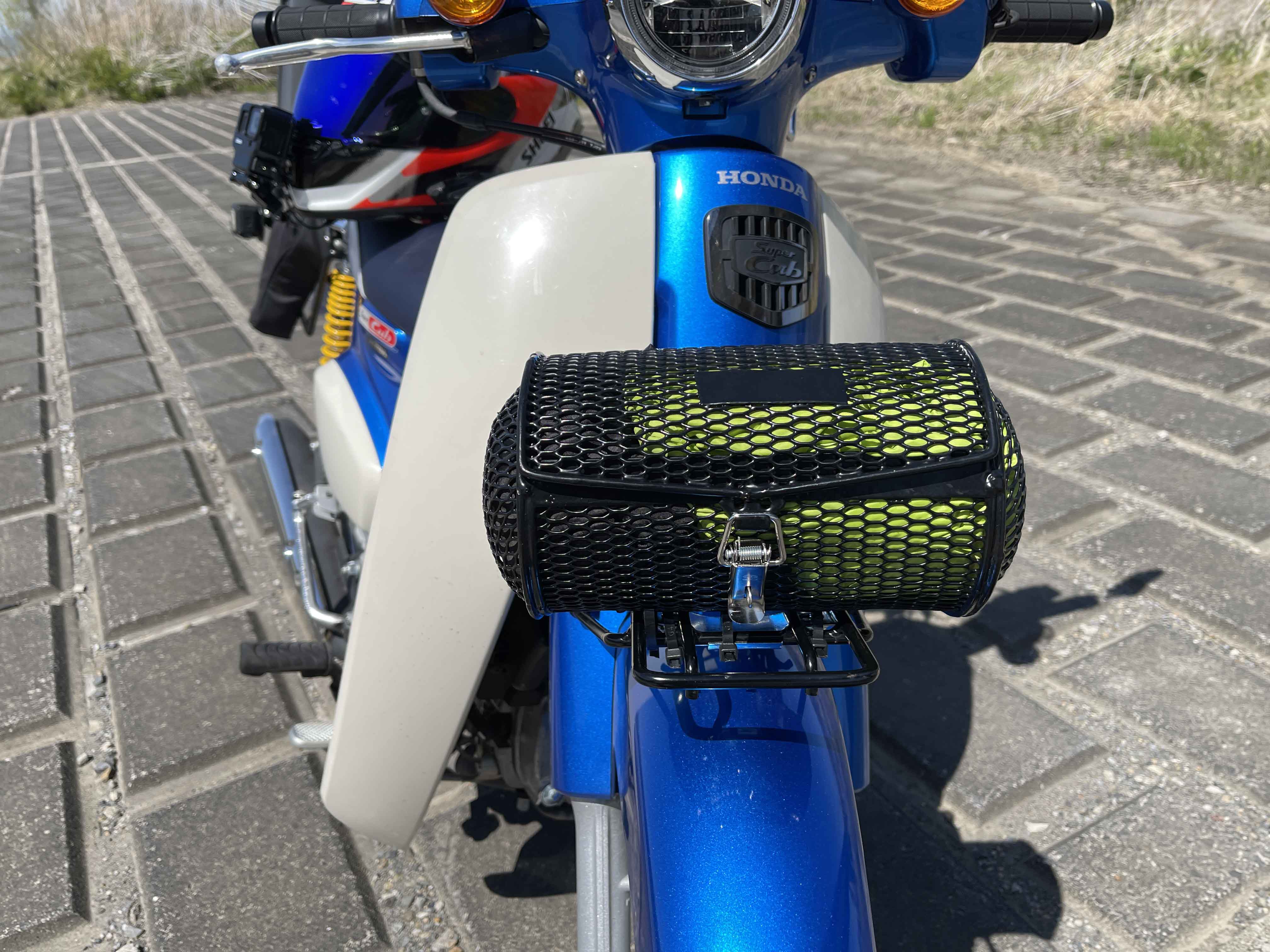取り付けた当時はテンション上がりました。なんかスーパーカブのフロント周りが「かわいくなったなー」なんて。実際、収納力は少ないですがちょっとしたものなら収納できます。いっぱい荷物を収納したい人は普通のカゴをつけたほうが絶対に良いと思います!